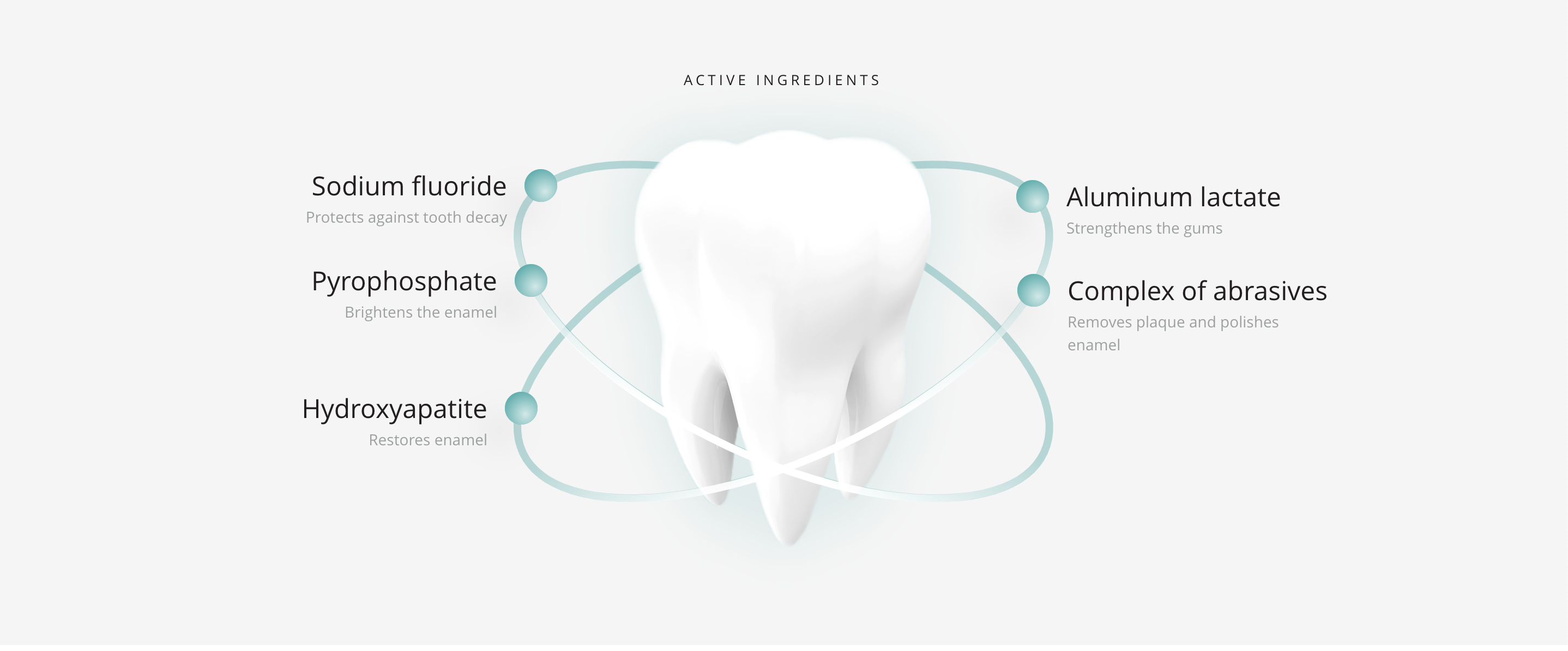 Aqua, Hydrogenated Starch Hydrolysate, Hydrated Silica, Hydroxyapatite, Silica, Poloxamer 188, PEG - 32, Sodium Lauryl Sulfate, Disodium Pyrophosphate, Aroma, Pentasodium Triphosphate, Tetrapotassium Pyrophosphate, Cellulose Gum, Sodium Fluoride, Titanium Dactinium Dioxide Methylparaben, Propylparaben, Eugenol, Limonene.