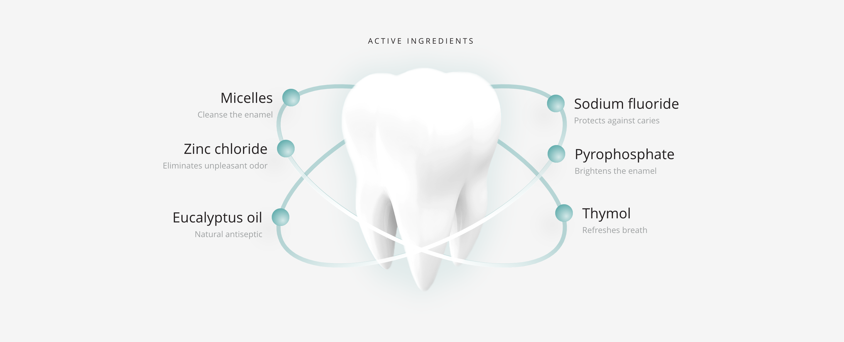 Aqua, Hydrogenated Starch Hydrolysate, Alcohol Denat., PEG-40 Hydrogenated Castor Oil, Tetrapotassium Pyrophosphate, Disodium EDTA, Aroma, Menthol, Citric Acid, Lauryl Glucoside, Sodium Saccharin, Zinc Chloride, Propylene Glycol, Eucalyptus Globulus Leaf Oil, Thymol, Sodium Fluoride. Содержание ионов фтора 102 ppm.